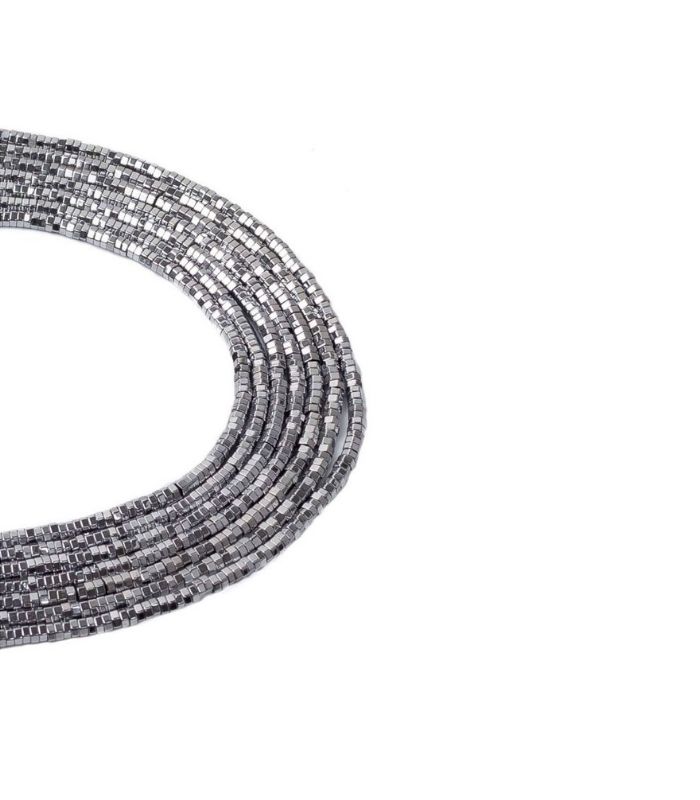 Hematit Gümüş Renkli Altıgen Doğaltaş Dizi, ortalama 2×1 mm taşlardan oluşur ve yaklaşık 40 cm uzunluğunda bir dizidir. Dizide ortalama 380 adet taş bulunmaktadır. A+ kalite işçilikle hazırlanmış bu taş, gümüş renkli parlak yüzeyi ve altıgen kesimiyle modern bir görünüm sunar.