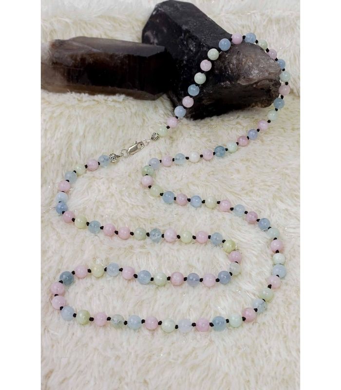 Zarafetin ve sevginin sembolü Morganit Doğaltaş Kolye, ortalama 6 mm küre kesim taşlardan hazırlanmıştır. Uzunluğu 74 cm olup özel tasarım makrome ip ile örülmüştür. Kolyede yaklaşık 93–96 adet Morganit taşı kullanılmıştır. Bu yoğun taş dizilimi, hem görsel zenginlik hem de güçlü bir enerji alanı oluşturur.