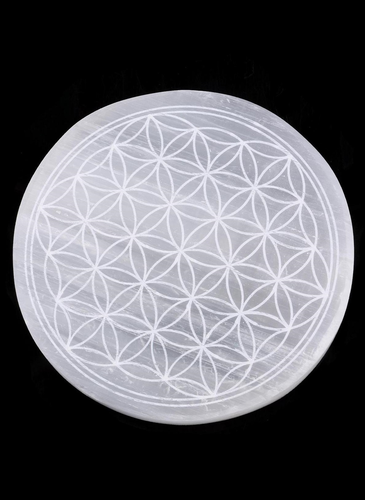 Saflık ve arınmanın sembolü olan Selenit Doğaltaş Daire Yaşam Çiçeği Motifli ile tanışın
